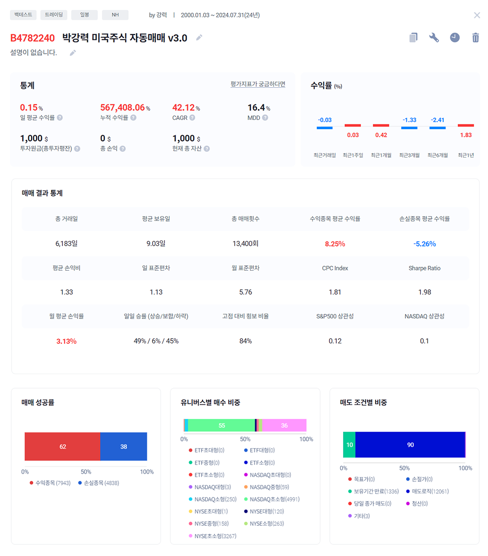 CAGR 42.12% ㅣ MDD 16.4% ㅣ 월평균손익률 3.13% ㅣ 평균 손익비 1.33 ㅣ 승률 62% |